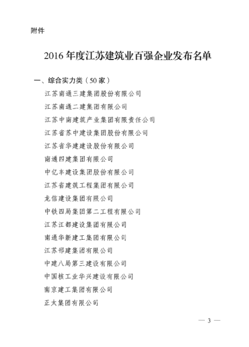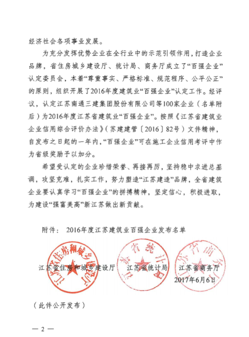 In the assessment of ‘Top 100 Enterprises in 2016’ Accreditation Committee jointly established by Jiangsu Housing and Urban-Rural Construction Department, Jiangsu Bureau of Statistics and Jiangsu Commerce Department, Zhonggang Construction Group Company won the honorary title of ‘Top 100 Enterprises of Jiangsu Construction Industry in 2016’