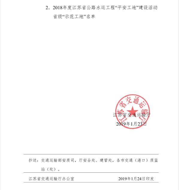 南通港呂四港區進港航道工程 榮獲“2018年度江蘇省級平安示范工地”榮譽稱號