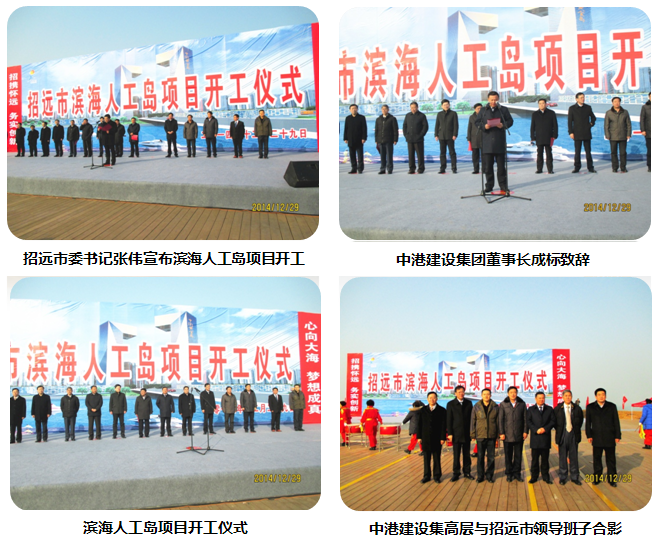 2014年12月29日10點08分,中港建設集團舉行了濱海人工島項目開工儀式。山東省招遠市領導張偉、王光耀、林建東、徐林宏、郝永平、趙曙光、馬立海等市級領導班子成員,中港建設集團成標董事長、秦高舉副董事長、崔大凡副總裁、黃波副總裁等集團高管,總承包單位中國技術進出口公司相關負責人,招遠市各鎮(zhèn)主要負責人,及人工島指揮部成員、各有關單位一同參加開工儀式。